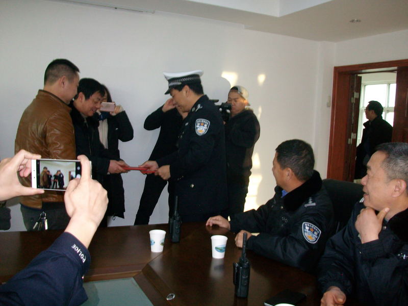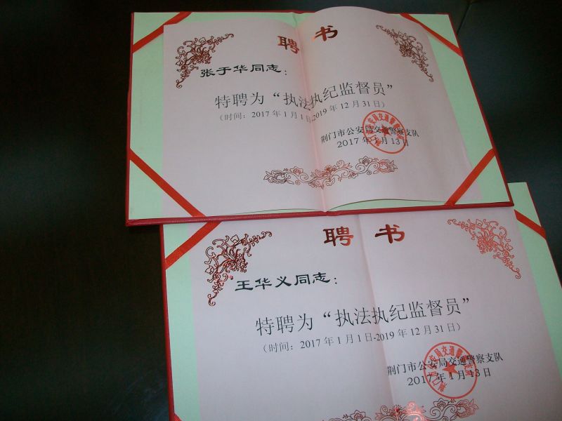 交警在對他們進(jìn)行獎勵外,并給他們頒發(fā)了荊門交警支隊執(zhí)法執(zhí)紀(jì)監(jiān)督員聘書。