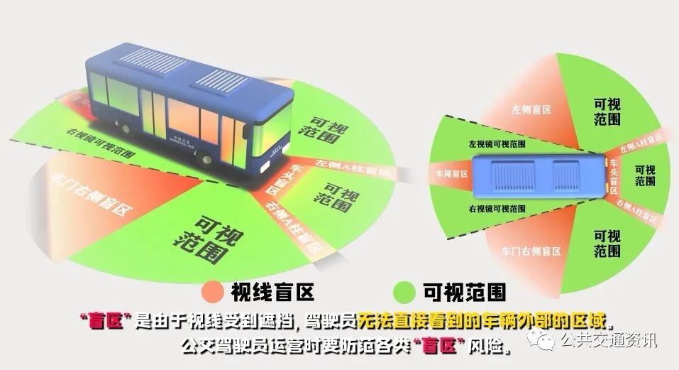 “盲區(qū)”是由于視線受到遮擋,駕駛員無法直接看到的車輛外部的區(qū)域。公交駕駛員運(yùn)營時要防范各類“盲區(qū)”風(fēng)險。