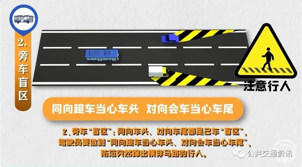 2、旁車“盲區(qū)”:同向車頭、對向車尾都是己車“盲區(qū)”,駕駛員要做到“同向超車當(dāng)心車頭、對向會車當(dāng)心車尾”,防范突然躥出橫穿馬路的行人。