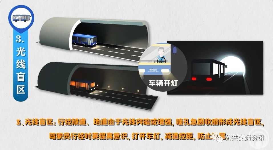3、光線盲區(qū):行經(jīng)隧道、地道由于光線突暗或增強(qiáng),瞳孔急劇收縮形成光線盲區(qū),駕駛員行經(jīng)時要提高意識,打開車燈,減速控距,防止追尾。