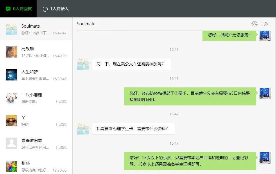 8月份升級開通網(wǎng)絡(luò)人工客服,市民通過荊門公交微信公眾號,與人工客服1號、2號坐席進行溝通,建立起集咨詢、尋物、建議、投訴等一體化的綜合在線服務(wù)。