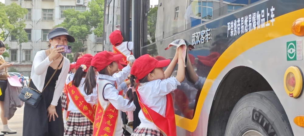 圖/同學(xué)們體驗公交車清潔過程,自備小抹布為車身擦拭水漬,共護公交出行環(huán)境,倡導(dǎo)綠色出行。