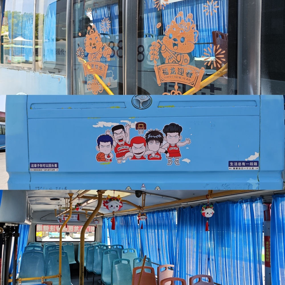 2020#車還有另外幾處細(xì)節(jié),引起小編注意,上下車門處貼有卡通人物和“福龍迎春”貼紙,車尾部貼有“灌籃高手”人物貼紙和提示標(biāo)語,車廂內(nèi)的扶手桿則掛滿了喜慶娃娃。看到這些裝飾和布置,仿佛感受到了駕駛員的熱情、認(rèn)真和細(xì)膩。