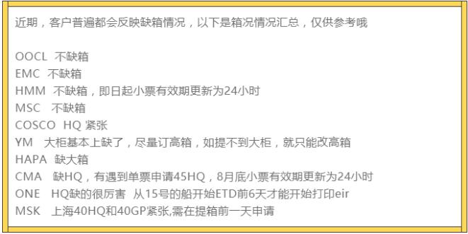 除了運費上漲之外,最近又出現(xiàn)了新一輪的空箱短缺,這就很難再提柜了!各大船公司已經(jīng)調(diào)整了提柜的措施!以下是案例條件的總結,僅供您參考。