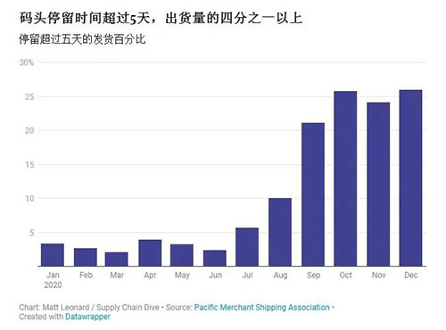洛杉磯、長灘港口情況嚴峻,新的一年并沒有太大的改觀。依然是擁堵嚴重,新冠感染人數(shù)的上升和陸地運輸?shù)难舆t,讓港口貨物堆積越來越多,增加了集裝箱船卸貨的進度。很多國內過來的集裝箱船都無法靠港卸貨,相關人士預計普船靠港卸貨時間預計需要一到兩周的時間。