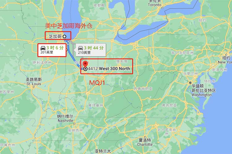 從芝加哥到MQJ1倉卡車路程201英里,大概三小時路程。紐酷國際美中拆柜海卡的價格(雙清包稅)大概是9元左右一公斤。