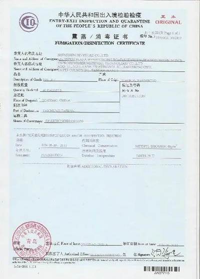 4)熏蒸(消毒)處理過(guò)的木質(zhì)包裝物要21天內(nèi)盡快出運(yùn),同時(shí)要注意單獨(dú)存放,并與其它未處理的木制品、木料隔離。 熏蒸(消毒)證書(shū)的有效期為21天。