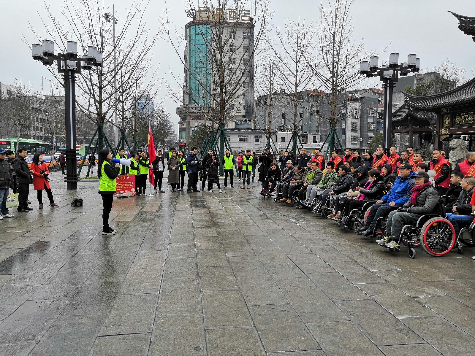 龍泉公園長(zhǎng)廊,在公園導(dǎo)游的介紹下,殘疾朋友及隨行的志愿者們更清楚的知道了龍泉公園的建園歷史和荊門故事。