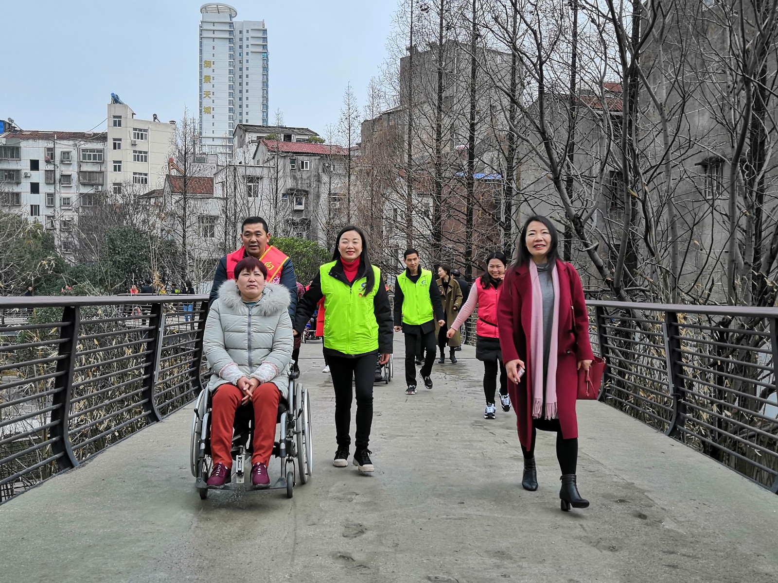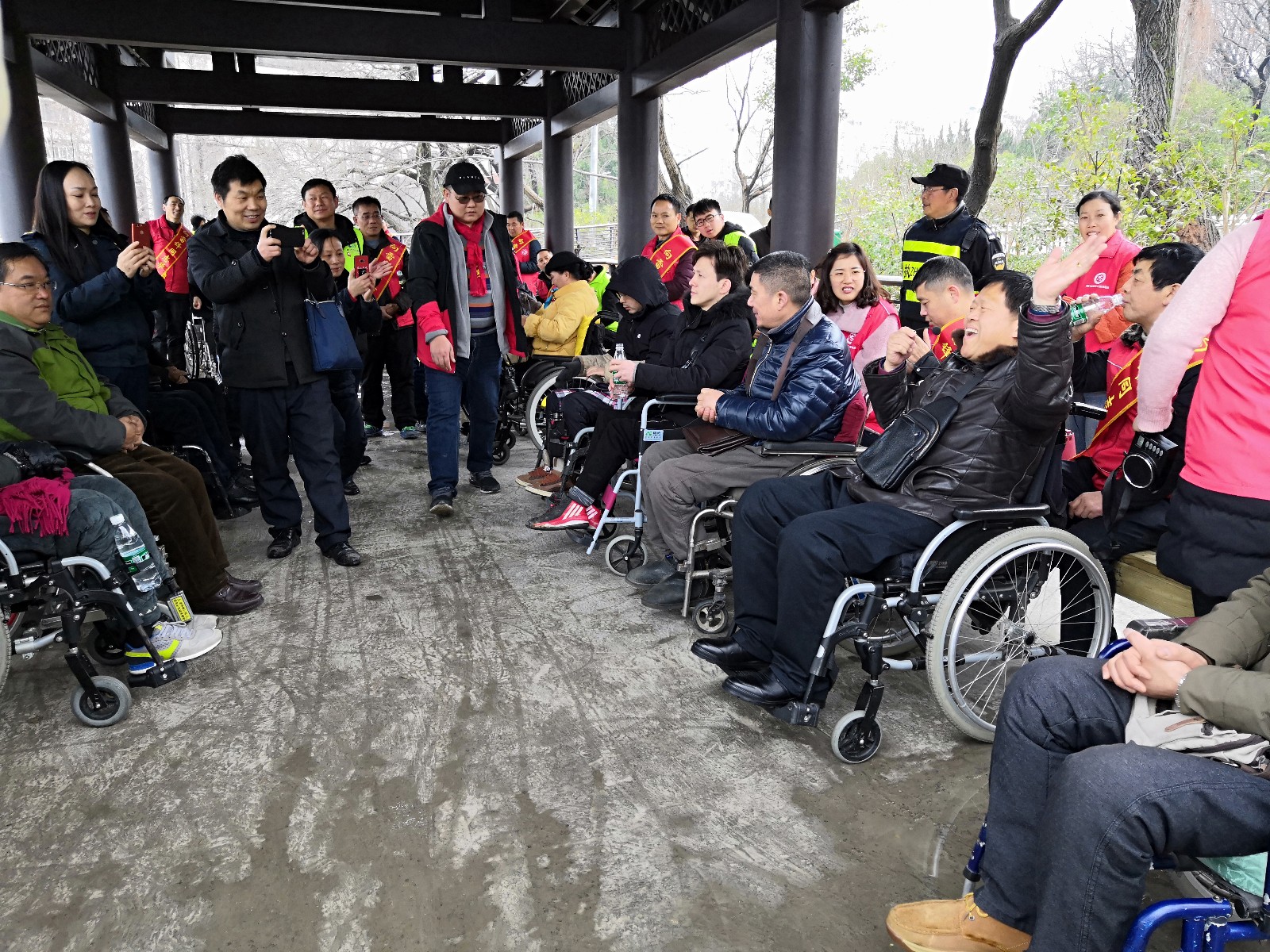 在公園新修建的盤山橋上,志愿者們推行著輪椅,與殘疾朋友以新的視角欣賞著山園美景,一路上歡歌笑語(yǔ)。在涼亭里大家輪流著唱歌助興,敞開心扉,訴說(shuō)著心中的故事。