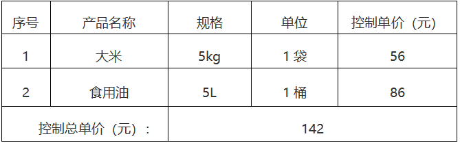 預算金額:本次詢價對大米、食用油的單價、合計總單價進行詢價,在各分類報價不超過控制單價(含稅)的前提下,控制總單價142元,超過此采購預算的報價無效。
